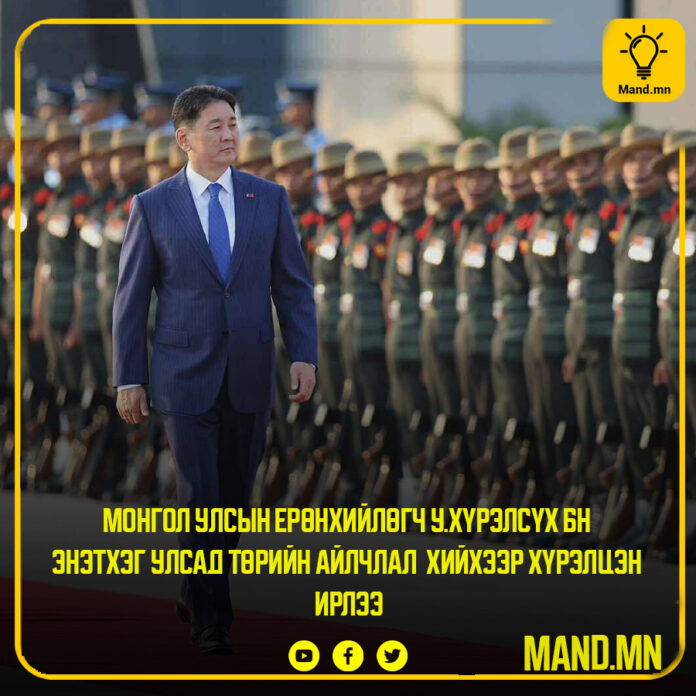 Хөгжимд хоёр орны Төрийн дуулал эгшиглэж, Хүндэт харуулын дарга Монгол Улсын Ерөнхийлөгчид айлтгал өргөлөө. Ерөнхийлөгч У.Хүрэлсүх Хүндэт харуулд хүндэтгэл үзүүлсний дараа угтах ёслолд хүрэлцэн ирсэн БНЭУ болон Монгол Улсын албаны төлөөлөгчидтэй мэндчиллээ.