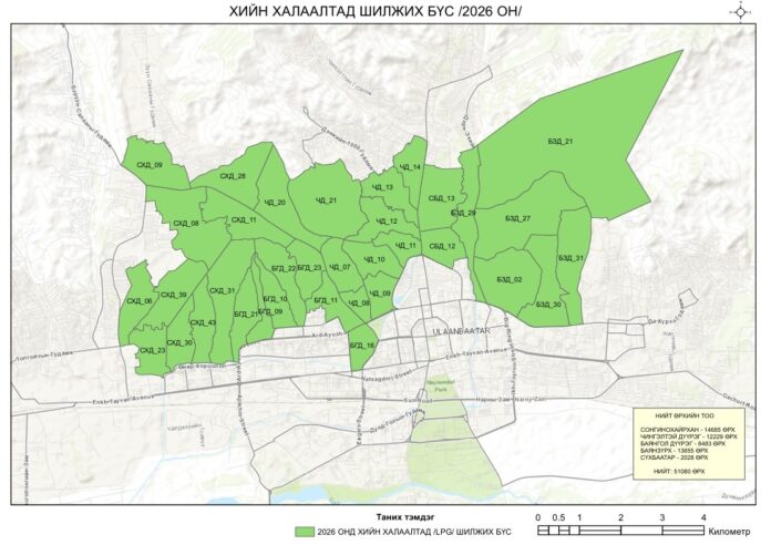 - Баянзүрх дүүргийн 2, 21, 27, 29, 30, 31 дүгээр хорооны 13655 өрх,