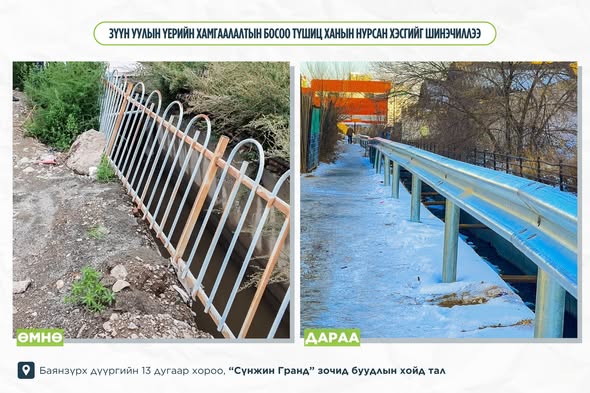 Тодруулбал, өнгөрсөн зун усархаг борооны улмаас Баянзүрх дүүргийн 13 дугаар хороо, “Сүнжин Гранд” зочид буудлын хойд талд байрлах Зүүн уулын үерийн хамгаалалтын босоо түшиц хана нурсан. Нурсан хэсгийг сэргээн 40 метр урт, 30 метр өргөн, 20 см зузаан босоо түшиц хана болон тусгаарлах хашлагыг шинээр барилаа.
