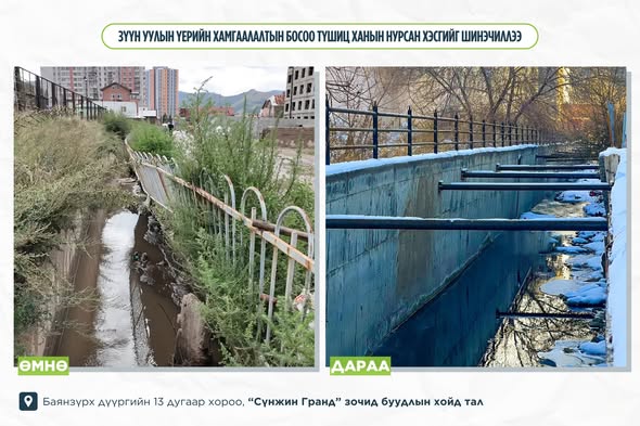 Тодруулбал, өнгөрсөн зун усархаг борооны улмаас Баянзүрх дүүргийн 13 дугаар хороо, “Сүнжин Гранд” зочид буудлын хойд талд байрлах Зүүн уулын үерийн хамгаалалтын босоо түшиц хана нурсан. Нурсан хэсгийг сэргээн 40 метр урт, 30 метр өргөн, 20 см зузаан босоо түшиц хана болон тусгаарлах хашлагыг шинээр барилаа.
