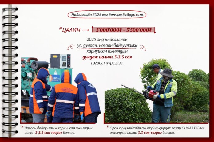 Нийслэлээс 2025 онд ногоон байгууламж хариуцсан ажилчдын цалинг 3-3.5 сая төгрөг, Орон сууц нийтийн аж ахуйн удирдах газар ОНӨААТҮГ-ын ажилчдын дундаж цалинг 3.3 сая төгрөг болгож нэмэгдүүллээ. Нийслэлийн есөн дүүрэгт нийт 157 га талбайд ногоон байгууламжийн арчилгааны 27 байгууллага 320 ажилтантай ажилладаг. Ногоон байгууламжийн арчилгаа хариуцсан ажилчид сард 1.7-1.9 сая төгрөгийн цалин авдаг байсныг нийслэлийн Засаг даргаас өгсөн үүрэг чиглэлийн дагуу нэмэгдүүлж, 3.5 сая төгрөгт хүргэсэн. Мөн ногоон байгууламжийн 1 га талбайн арчилгааны үнэлгээ 100 орчим сая төгрөг байсныг 150 сая төгрөг болгож нэмэгдүүлсэн юм.