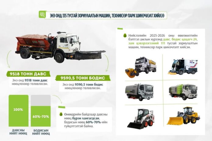Нүүр хуудасМэдээНИЙСЛЭЛ: 2025-2026 оны өвөлжилтийн бэлтгэл ажлын хүрээнд 9518 тонн давс, 9590 тонн...
