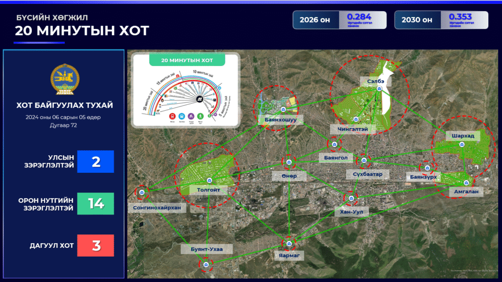 Ингэхдээ ирэх таван жил нийслэл Улаанбаатар хотыг тогтвортой, иргэдийн амьдрах орчныг сайжруулж, хүртээмжтэй, эдийн засгийн өрсөлдөх чадвартай “20 минутын хот” бодлогын хүрээнд бүсчлэн улсын зэрэглэлтэй 2, орон нутгийн зэрэглэлтэй 14, дагуул 2 хот болгон хөгжүүлэхээр төлөвлөжээ. Тухайлбал нийслэлийн ерөнхий боловсролын нийт 150 сургууль байгааг 2030 он хүртэл 84 сургуулиар нэмэгдүүлэх байна. Одоогоор анги бүр 50-иас дээш сурагчтай бөгөөд нийслэлийн хэмжээнд 300 мянган сурагч байгаагаас хүчин чадлын хэтрэлт 150 мянга гарчээ. Тиймээс 84 сургууль шинээр барьснаар 25 сурагчаар буурах байна. Тэгвэл эрүүл мэндийн салбарт нийслэлийн хэмжээнд ажиллаж буй 1,2,3 шатлалын нийт 216 эмнэлгийн үйлчилгээ, хүртээмжийг нэмэгдүүлж эрт илрүүлэг, товлолт вакцины хамрах хүрээг нэмэгдүүлэх байна. Нийслэлд 1.7 сая хүн амтай. Үүний 1.1 сая нь хөдөлмөрийн насных бөгөөд үүнээс 627 мянга гаруй буюу 55 хувь нь хөдөлмөр эрхэлж байна. Тэгвэл 2030 он гэхэд ажиллах хүчний оролцох түвшнийг 0.642 байгааг 0.650 болгож нэмэгдүүлэх байна. Нийтийн тээврийн бодлогыг шинэчилж нийтийн тээврийн зорчилтыг нэмэгдүүлэх, авто замын томоохон бүтээн байгуулалтыг өрнүүлж нийт 191км зам тавих байна. Одоогоор нийслэлд 1 хүнд ногдох ногоон байгууламж 6.5мкв байгаа бол үүнийг 9мкв болгон нэмэгдүүлэх болон бусад төлөвлөлтүүдийг нь салбар, бүсчлэлээр нь хийсэн гэдгийг онцоллоо.