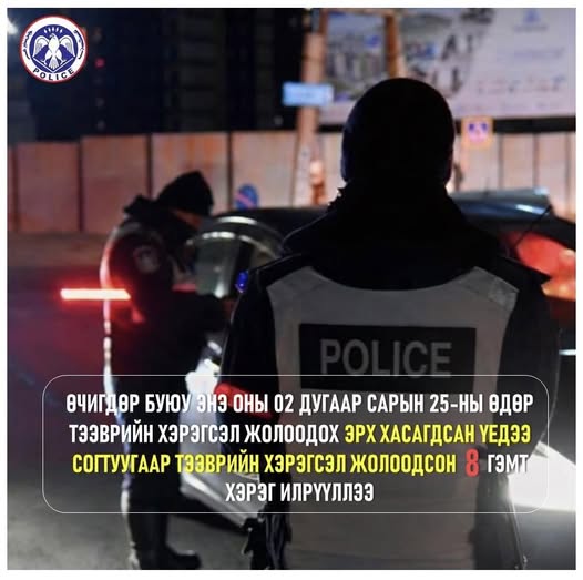 Хоногийн хугацаанд /2026.02.25/ тээврийн хэрэгсэл жолоолох эрх хасагдсан үедээ согтуугаар тээврийн хэрэгсэл жолоодсон 8 гэмт хэрэг илрүүллээ.
