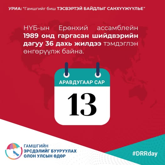 НҮБ-ын Ерөнхий ассамблейн 1989 онд гаргасан шийдвэрийн дагуу жил бүрийн 10 дугаар сарын 13-ны өдрийг дэлхий нийтээр “Гамшгийн эрсдэлийг бууруулах олон улсын өдөр”-ийг тэмдэглэн өнгөрүүлдэг.