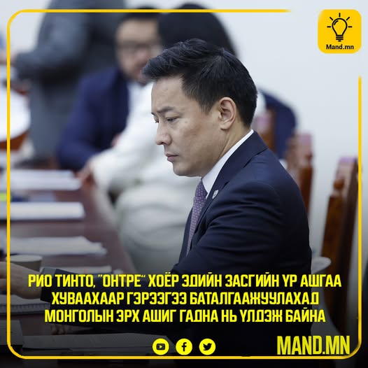 Нүүр хуудасНийгэмО.Батнайрамдал УИХ-ын гишүүн: Рио Тинто, “Онтре” хоёр эдийн засгийн үр ашгаа хуваахаар... Нийгэм О.Батнайрамдал УИХ-ын гишүүн: Рио Тинто, “Онтре” хоёр эдийн засгийн үр ашгаа хуваахаар гэрээгээ баталгаажуулахад Монголын эрх ашиг гадна нь үлдчихэж байгаа юм Энэ асуудлыг Монголын тал яаралтай ойлгомжтой болгох ёстой. Тэгж байж бид Оюу толгойн бүлэг ордын 30 хувийн нөөцөөс ямар ашиг орлого авах нь ойлгомжтой болно. Тийм учраас Засгийн газар энэ дээр яаралтай шийдлээ гаргаж, гэрээ хэлцийн саналаа Улсын их хуралд оруулж ирэх хэрэгтэй By Mandmn 4 сар 23, 2025 0 19 FacebookTwitterPinterestWhatsApp FacebookTwitterPinterestWhatsApp өмнөх нийтлэлБЯ: Холбооны Бүгд Найрамдах Сомали Улсаас Монгол Улсад хавсран суух Онц бөгөөд Бүрэн эрхт Элчин Сайд Ходан Осман Абдиг хүлээн авч уулзлааДараагийн нийтлэлНИЙСЛЭЛ: Ази, Номхон далайн бүсийн “Аспак-2025” чуулга уулзалтыг Улаанбаатар хотод зохион байгуулна Mandmnhttps://mand.mn/ Холбоотой мэдээ Мэдээ УИХ: Түгээмэл тархацтай ашигт малтмалын тухай хуульд нэмэлт, өөрчлөлт оруулах тухай хуулийн төслийг хэлэлцэхийг дэмжлээ Mandmn - 12 сар 19, 2025 Мэдээ НИЙСЛЭЛ: Таван шарын явган зорчигчийн гүүрэн гарцын барилга угсралтын ажлыг хийхээр бэлтгэж байна Mandmn - 12 сар 19, 2025 Мэдээ ЦХИХХЯ: Японы Засгийн газрын буцалтгүй тусламжаар “Монгол улсын онц чухал мэдээллийн дэд бүтцийн аюулгүй байдлын удирдлага, хариу арга хэмжээ авах чадавхыг бэхжүүлэх төлөвлөгөө”-г хэрэгжүүлэх... Mandmn - 12 сар 19, 2025 ХАРИУ ҮЛДЭЭХ Хариу цуцлах санал: Сэтгэгдэл оруулна уу! нэр:* энд нэрээ оруулна уу и-мэйл:* Та буруу имэйл хаяг оруулсан байна! Энд имэйл хаягаа оруулна уу вэб хуудас: Намайг дараагийн удаа сэтгэгдэл бичихдээ энэ хөтөч дээр миний нэр, имэйл, вэбсайтаас аваарай. Δ This site uses Akismet to reduce spam. Learn how your comment data is processed. ИХ УНШИГДСАН УИХ: Түгээмэл тархацтай ашигт малтмалын тухай хуульд нэмэлт, өөрчлөлт оруулах тухай хуулийн төслийг хэлэлцэхийг дэмжлээ 12 сар 19, 2025 “BEST of MONGOLIA -2025” оны шилдгийг тодруулах хэрэглэгч олон нийтийн цахим санал асуулга 10 дах жилдээ эхэллээ 12 сар 19, 2025 НИЙСЛЭЛ: Таван шарын явган зорчигчийн гүүрэн гарцын барилга угсралтын ажлыг хийхээр бэлтгэж байна 12 сар 19, 2025 ЦХИХХЯ: Японы Засгийн газрын буцалтгүй тусламжаар “Монгол улсын онц чухал мэдээллийн дэд бүтцийн аюулгүй байдлын удирдлага, хариу арга хэмжээ авах чадавхыг бэхжүүлэх төлөвлөгөө”-г хэрэгжүүлэх... 12 сар 19, 2025 илүү их ачаалах
