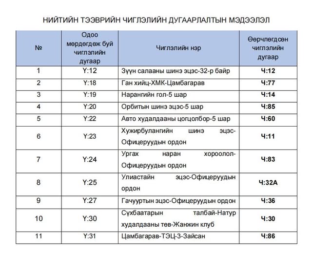Нэршилд өөрчлөлт орсон автобусны чиглэлүүдийн маршрут, цагийн хуваарь, тээврийн хэрэгслийн тоонд өөрчлөлт орохгүй, зөвхөн чиглэлийн Y:XX дугаар Ч:ХХ болон өөрчлөгдөнө