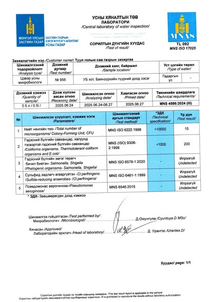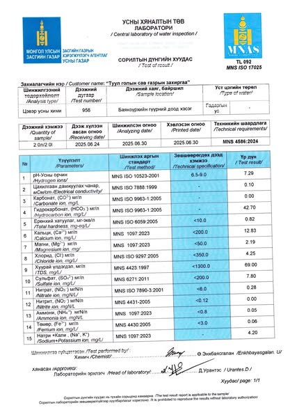 Туул голын уснаас 4 цэгт байршлаас авсан дээжинд Засгийн газрын хэрэгжүүлэгч агентлаг Усны газрын итгэмжлэгдсэн лабораторид хийгдсэн № 956, 957, 958, 959 тоот сорилтын дугаартай дээжүүдэд хими, нян судлалын шинжилгээний шинжлэгдсэн үзүүлэлтүүдийн дүнгээр Баянзүрхийн гүүр орчимд химийн хэрэгцээт хүчилтөрөгчийн үзүүлэлт стандартын шалгуураас 2,8 дахин их, биохимийн хэрэгцээт хүчилтөрөгч нь 2,6 дахин их гарсан нь “Усан орчны чанарын үзүүлэлт MNS 4586:2024” стандартын шаардлага хангахгүй байгаа тул ард иргэд туул голын уснаас анхаарал болгоомжтой хэрэглэхийг сануулж байна.