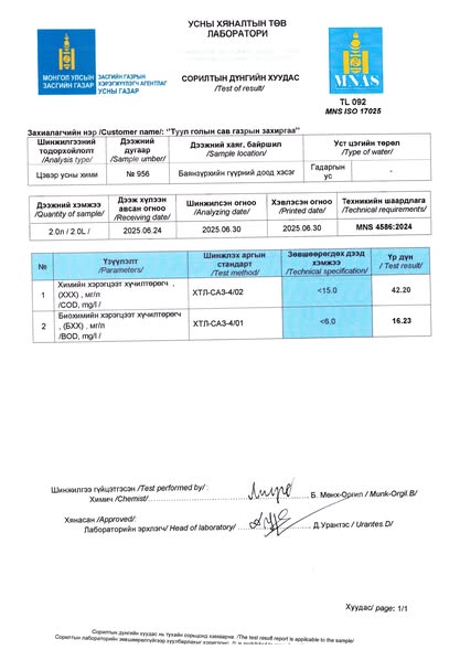 Туул голын уснаас 4 цэгт байршлаас авсан дээжинд Засгийн газрын хэрэгжүүлэгч агентлаг Усны газрын итгэмжлэгдсэн лабораторид хийгдсэн № 956, 957, 958, 959 тоот сорилтын дугаартай дээжүүдэд хими, нян судлалын шинжилгээний шинжлэгдсэн үзүүлэлтүүдийн дүнгээр Баянзүрхийн гүүр орчимд химийн хэрэгцээт хүчилтөрөгчийн үзүүлэлт стандартын шалгуураас 2,8 дахин их, биохимийн хэрэгцээт хүчилтөрөгч нь 2,6 дахин их гарсан нь “Усан орчны чанарын үзүүлэлт MNS 4586:2024” стандартын шаардлага хангахгүй байгаа тул ард иргэд туул голын уснаас анхаарал болгоомжтой хэрэглэхийг сануулж байна.