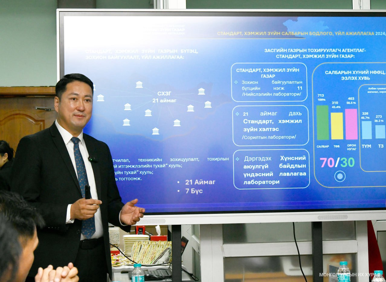 Уулзалтын эхэнд Стандарт, хэмжил зүйн газрын дарга С.Батбаатар хуулийн шинэчилсэн найруулгын төслийг танилцуулав. Тэрбээр, Стандарт, хэмжил зүйн газар 5 чиглэлээр үйл ажиллагаа явуулдаг бөгөөд салбарын гол харилцааг Стандартчилал, техникийн зохицуулалт, тохирлын үнэлгээний итгэмжлэлийн тухай хууль болон Хэмжил зүйн тухай хуулиар зохицуулж байна гээд салбарын бодлого, үйл ажиллагааны чиглэлээр мэдээлэл хүргэлээ.