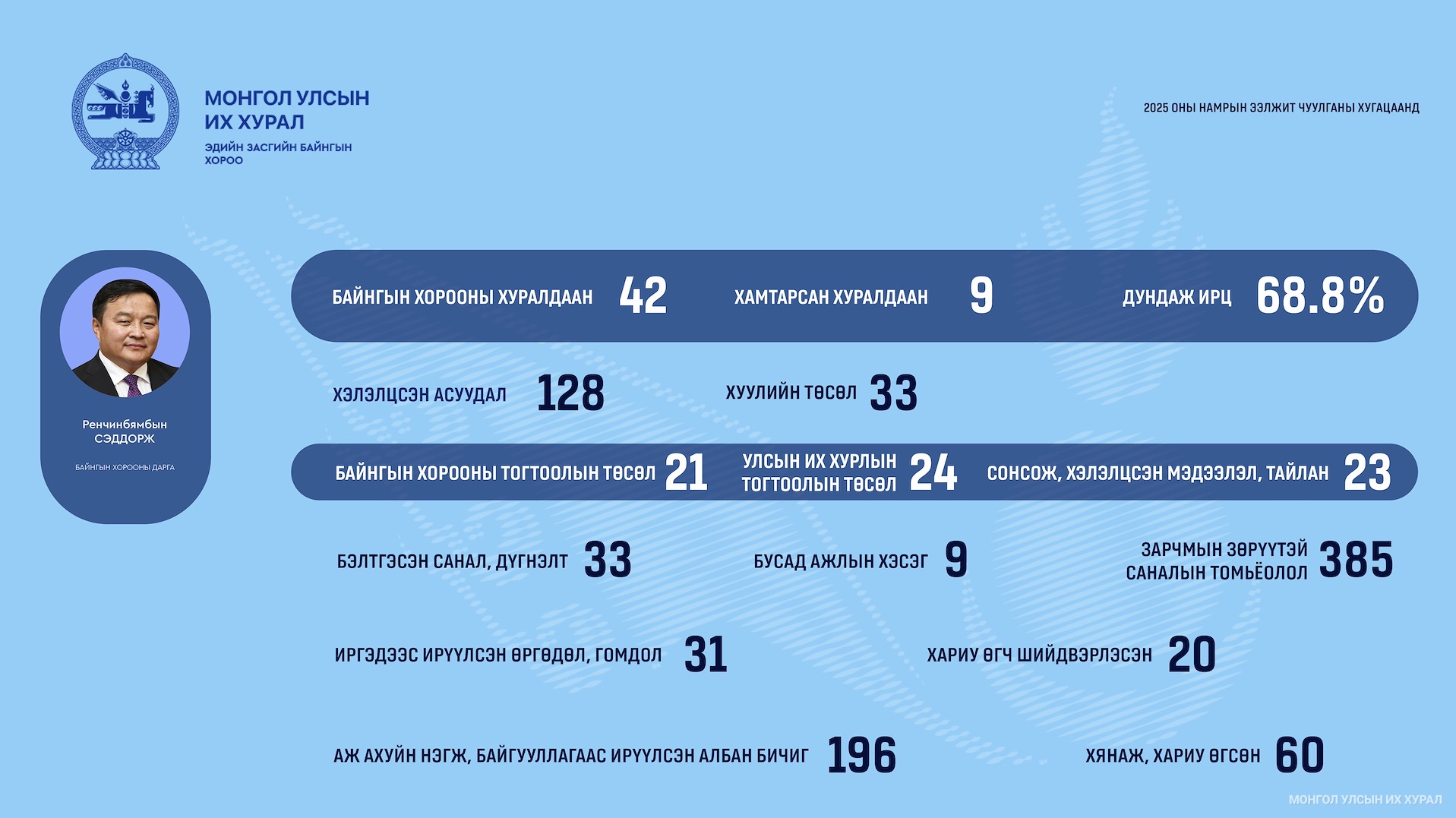Эдийн засгийн байнгын хороо 2025 оны намрын ээлжит чуулганы хугацаанд 42 удаа, Төрийн байгуулалтын байнгын хороотой хамтарч 2, Байгаль орчин, хүнс, хөдөө аж ахуйн байнгын хороотой хамтарч 3 удаа, Төсвийн байнгын хороотой хамтарч 4 удаа, нийт 51 удаа хуралдан эрхлэх асуудлынхаа хүрээнд хамаарах 128 асуудлыг хэлэлцэн шийдвэрлэсэн байна. Тодруулбал, 33 хуулийн төсөл, Улсын Их Хурлын 24 тогтоолын төслийг нэгдсэн хуралдаанаар хэлэлцүүлэх бэлтгэлийг ханган, батлуулж, яам, агентлаг, харьяа байгууллагын 23 тайлан, мэдээллийг хэлэлцэн шийдвэрлэж, Байнгын хорооны 21 тогтоолын төслийг баталсан байна.