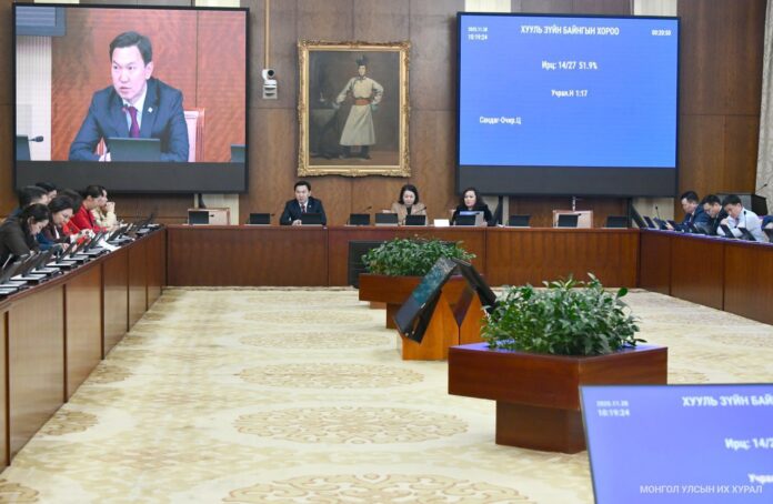 Улсын Их Хурлын Хууль зүйн байнгын хорооны өнөөдрийн (2025.11.28) хуралдаан 09 цаг 58 минутад гишүүдийн 51.9 хувийн ирцтэйгээр эхэлж, Үндсэн хуулийн цэцийн гишүүнийг үүрэгт ажлаас нь чөлөөлөх тухай асуудлыг хэлэлцэн шийдвэрлэв. Тус хуралдааныг Улсын Их Хурлын гишүүн О.Номинчимэг даргаллаа.