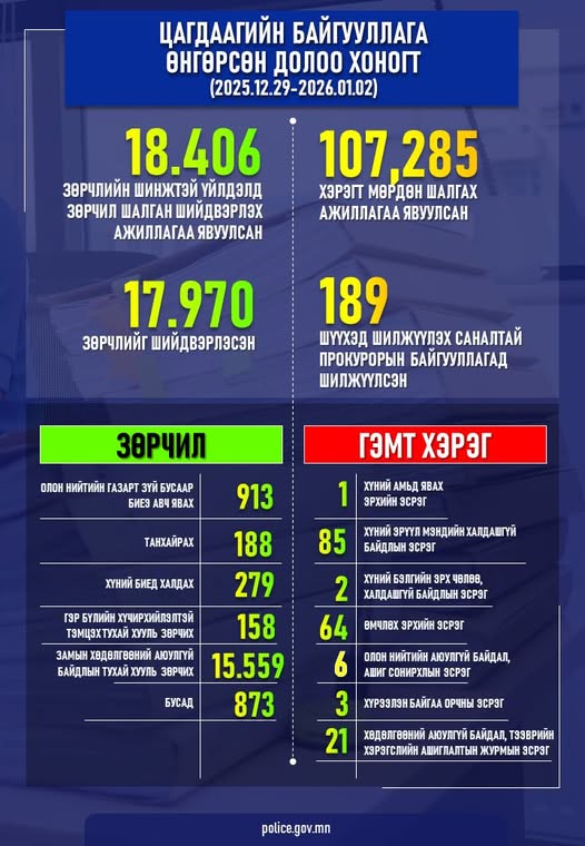 Цагдаагийн байгууллагаас 2025 онд 107,285 хэрэгт мөрдөн шалгах ажиллагааг явуулж, өнгөрсөн долоо хоногт (2025.12.29-өөс 2026 оны 01 дүгээр сарын 02-ны өдрүүдэд) 189 хэргийг шүүхэд шилжүүлэх саналтай прокурорын байгууллагад хүргүүлсэн байна. Үүнээс: