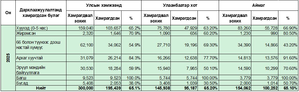 3. 2024-2025 онд нийт 320,100 хүн тун вакцин хүлээж авч, 2024 оны 8 дугаар сарын 25-ны өдрөөс эхлэн 5 сарын хугацаанд 304,251 хүнийг дархлаажуулсан ба хамралтын хувь 95.0% байна.