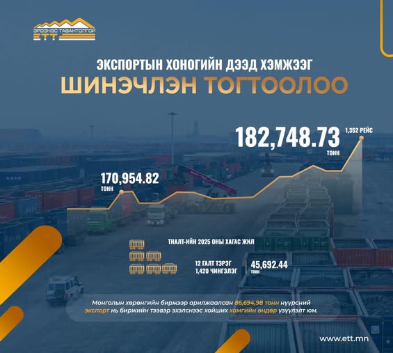 “Эрдэнэс Тавантолгой” ХК нь 2025 оны 12 дугаар сарын 15-ны өдөр биржийн болон урт хугацаат гэрээний нүүрсийг 1,352 рейсээр 182,748.73 тонныг экспортолж, өмнөх үзүүлэлтээс 10,015 тонноор нэмэгдүүлж бүх цаг үеийн экспортын хоногийн дээд хэмжээг шинэчлэн тогтоолоо. Үүний дотор Монголын хөрөнгийн биржээр арилжаалсан 86,694,98 тонн нүүрсний экспорт нь биржийн тээвэр эхэлснээс хойших хамгийн өндөр үзүүлэлт юм.