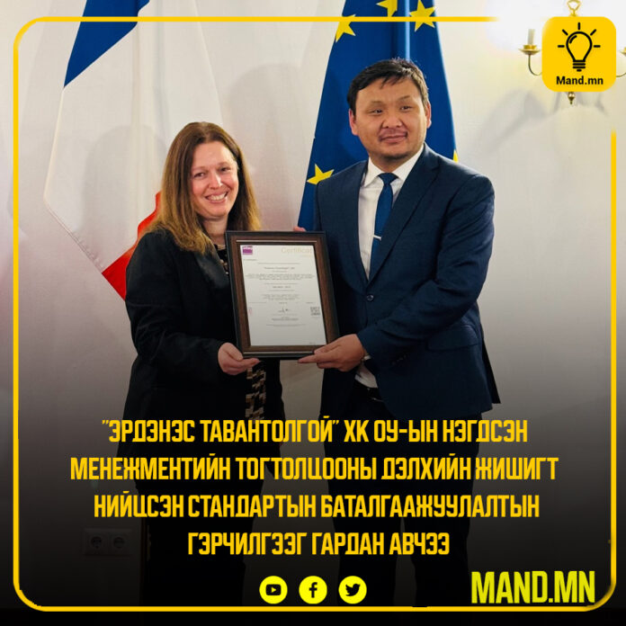 “Эрдэнэс Тавантолгой” ХК-ийн энэхүү 3 стандартын гэрчилгээг Афнор группээс олгосныг Франц Улсаас Монгол Улсад суугаа Онц бөгөөд Бүрэн эрхт Элчин сайд Коринн Пэрера Да Силва гардуулан өгч компанийн цаашдын нэгдсэн менежментийн тогтолцооны стандартын нэвтрүүлэлт, хэрэгжүүлэлтэд амжилт хүслээ.