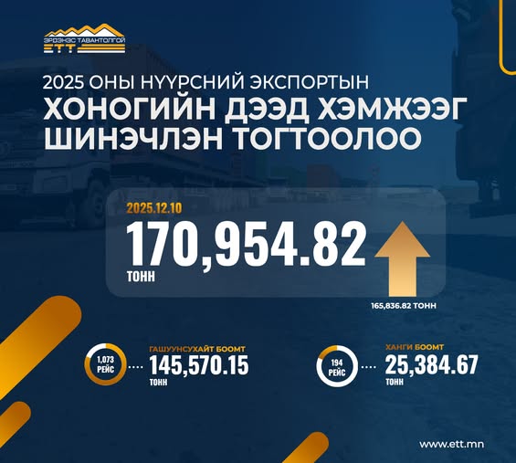 “Эрдэнэс Тавантолгой” ХК нь 2025 оны 12 дугаар сарын 10-ны өдөр биржийн болон урт хугацаат гэрээний нүүрсийг 1,267 рейсээр 170,954.82 тонныг экспортолж, өмнөх үзүүлэлтээс 5,118 тонноор нэмэгдүүлж 2025 оны экспортын хоногийн дээд хэмжээг шинэчлэн тогтоолоо. Үүнээс Гашуунсухайт боомтоор 1,073 рейсээр 145,570.15 тонн, Ханги боомтоор 194 рейсээр 25,384.67 тонн нүүрсийг тус тус экспортолжээ.
